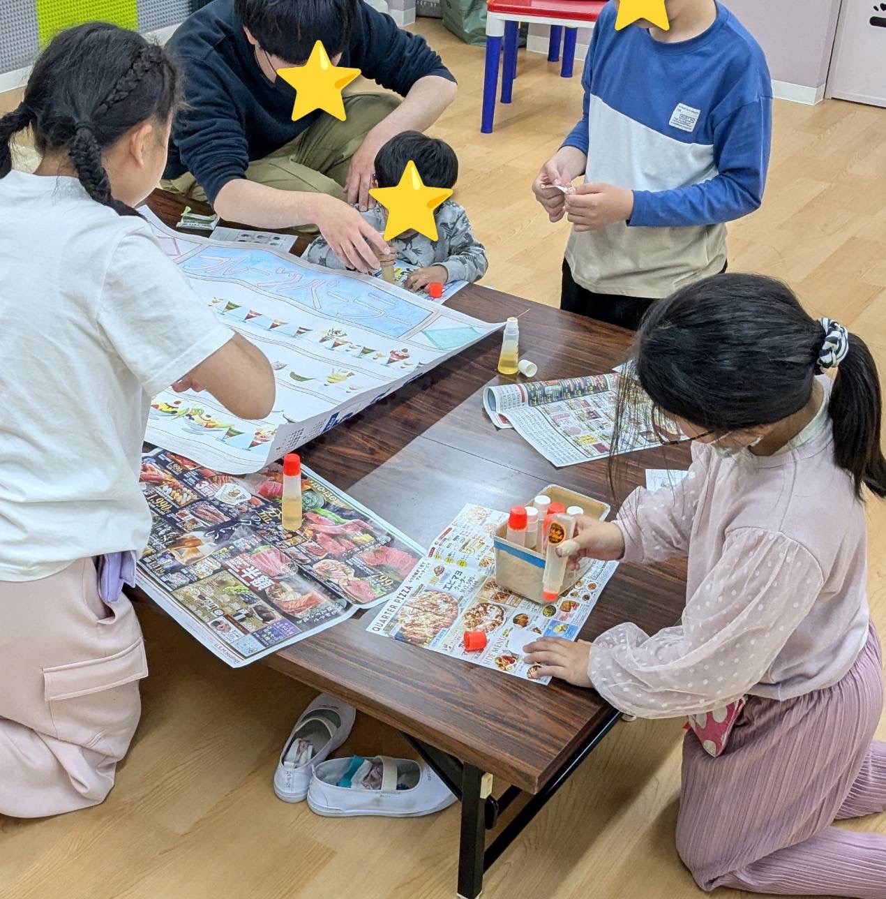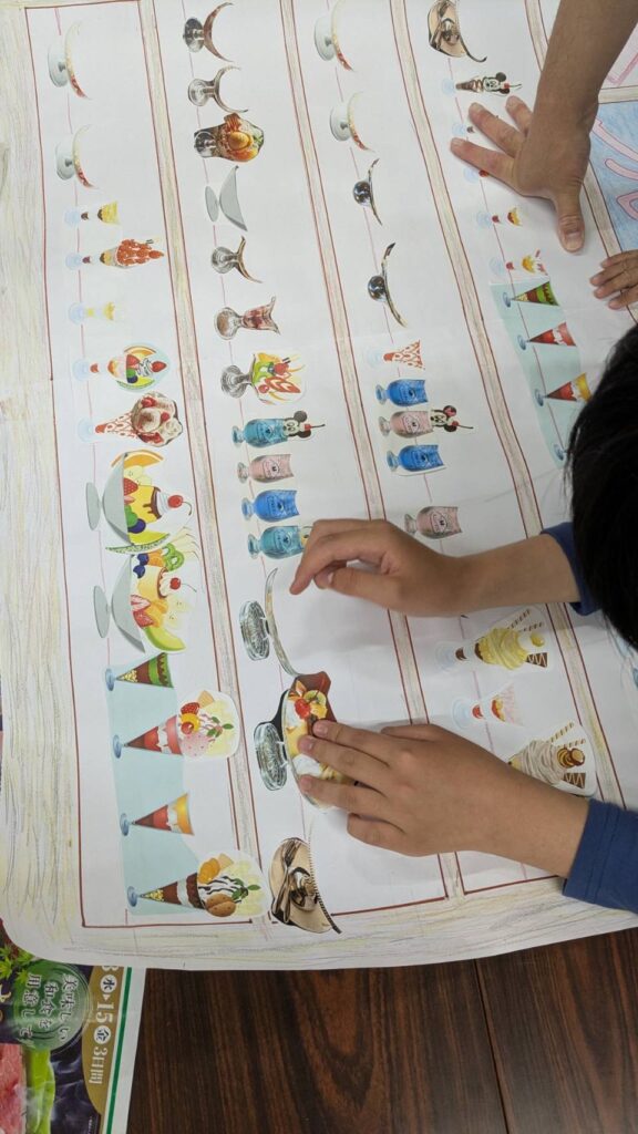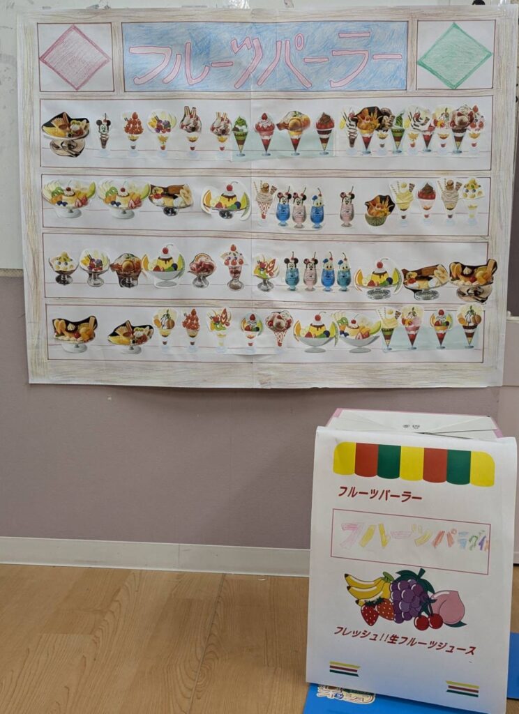 お店の名前を子どもたちが考えて、看板をたてたらショーケース作りです♪美味しくてカワイイメニューが完成しました❣