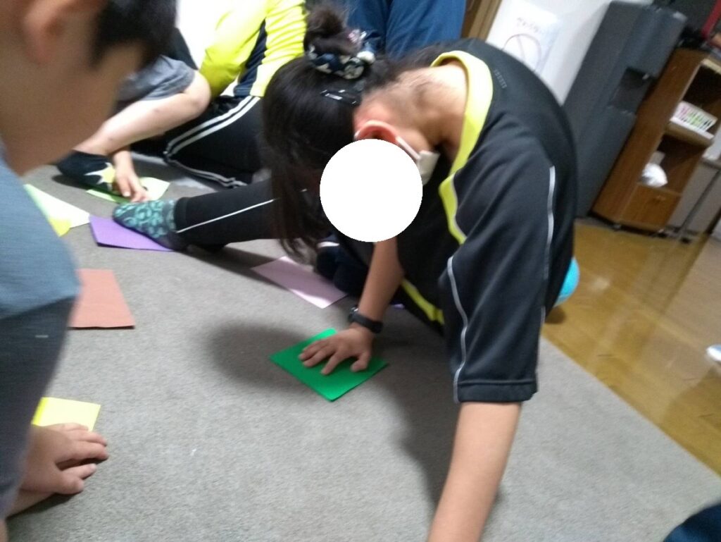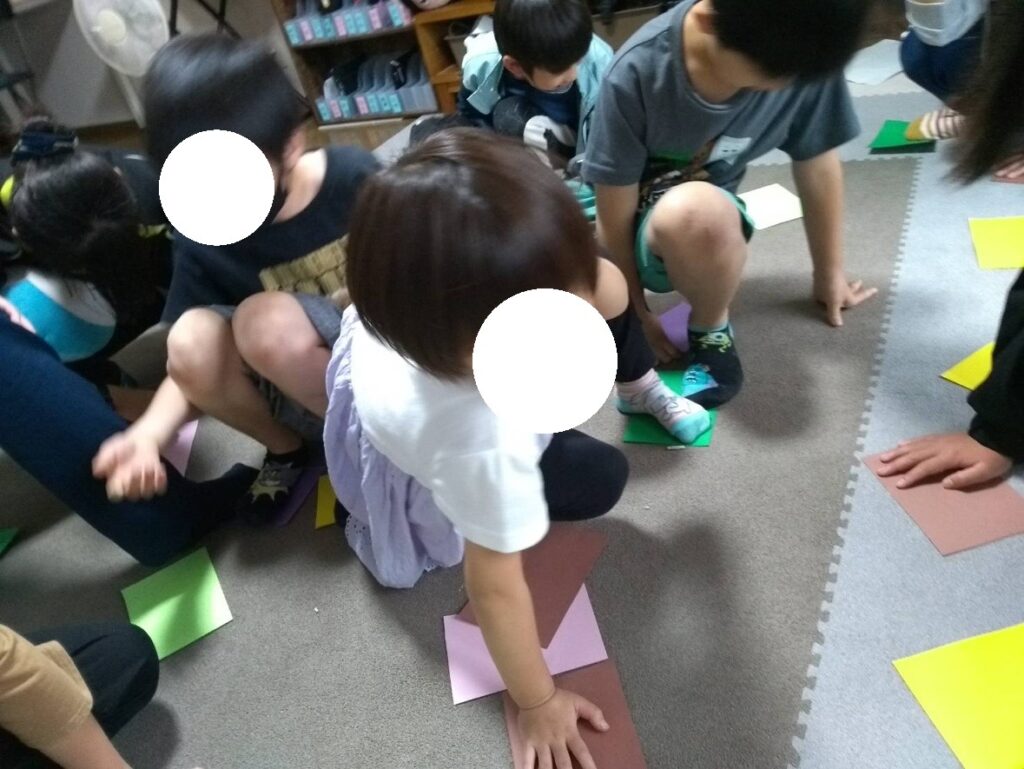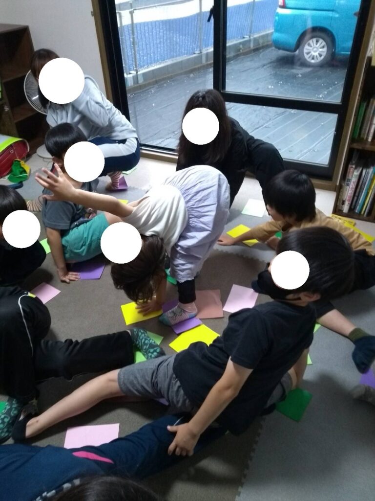 床においた色紙でツイスターゲームを行いました🌼